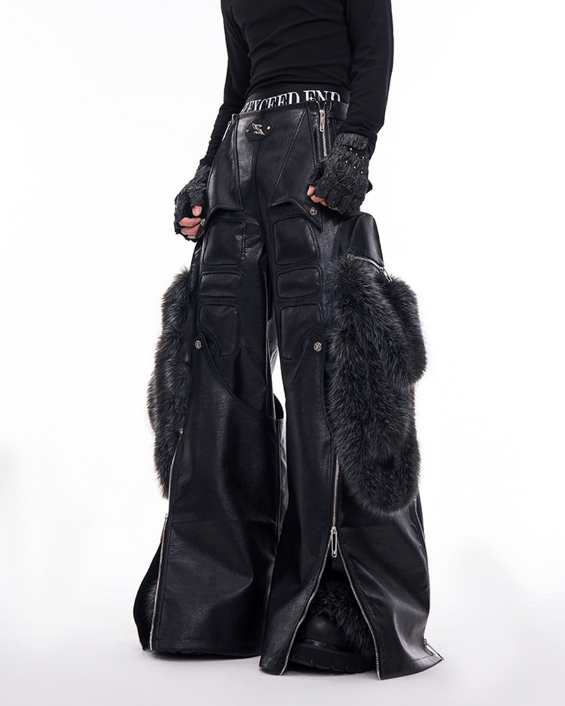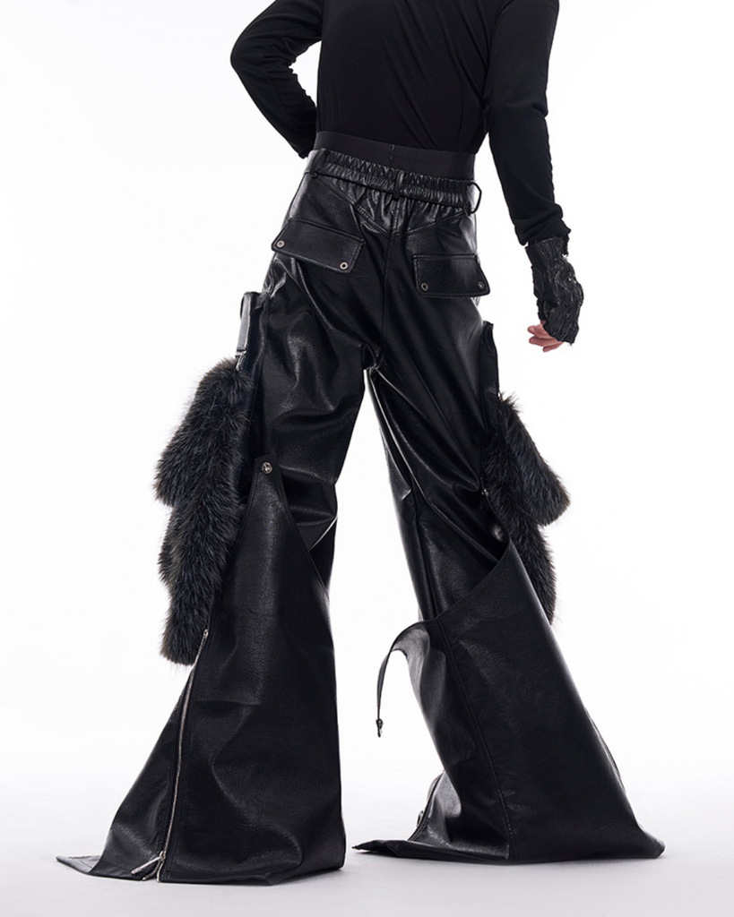 ダークなストリートスタイルが叶うレザー素材のワイドパンツ。