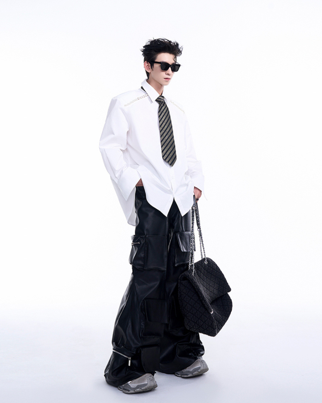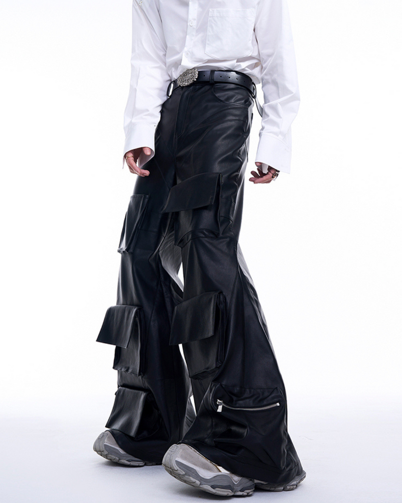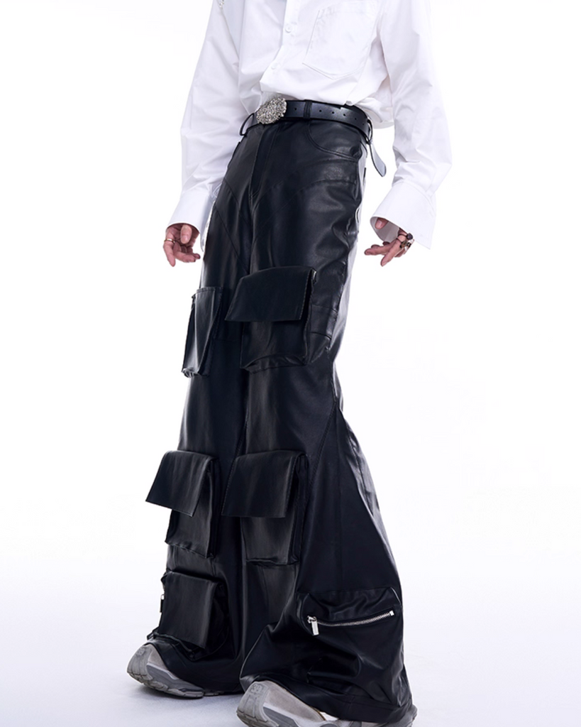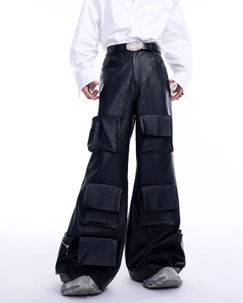 ポケットが存在感を放つレザー素材のワイドパンツ。