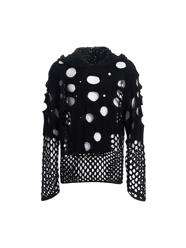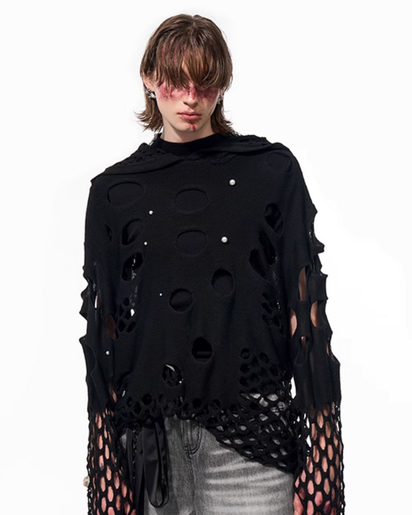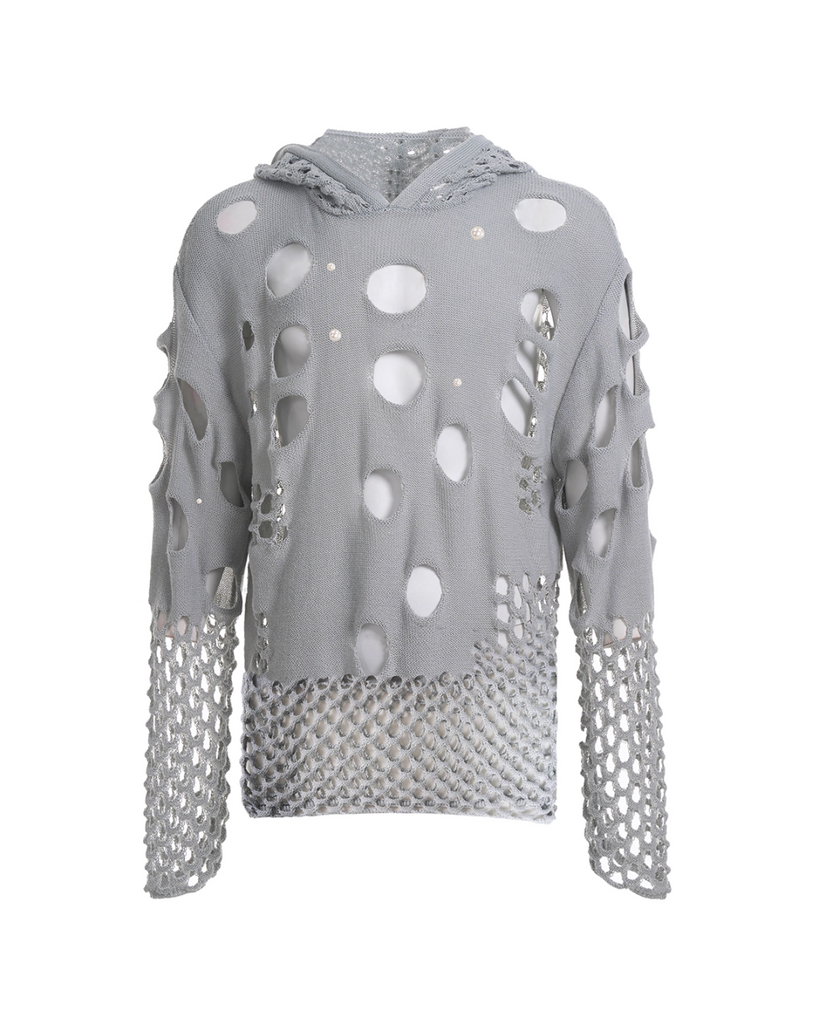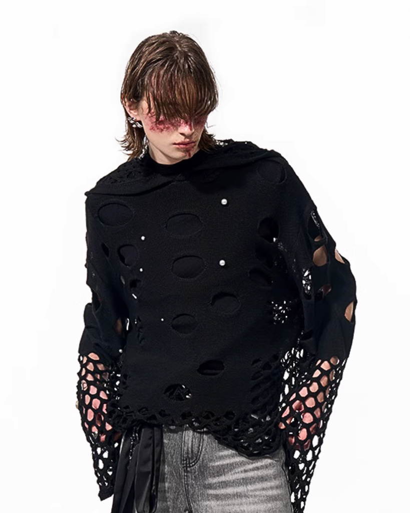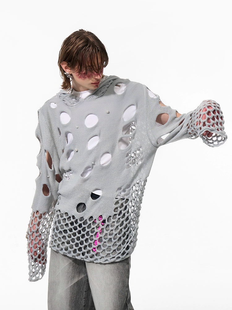 インパクト抜群の全面ダメージ入りのニットトップス。