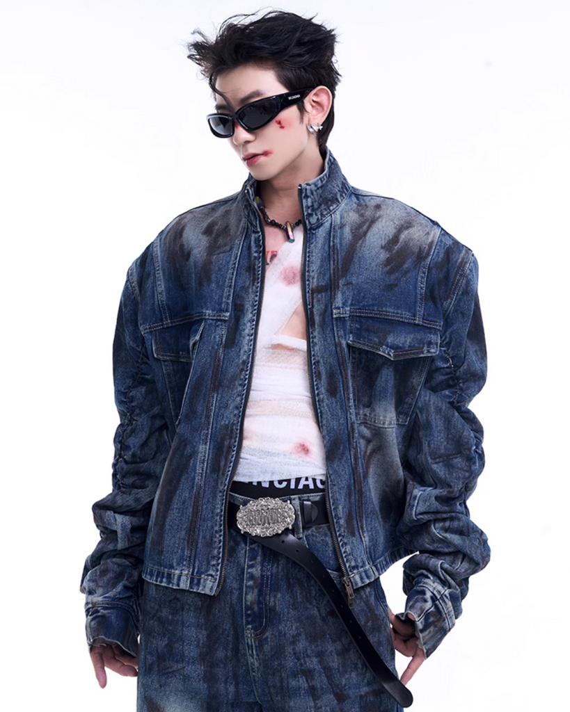 Dirty Stand Collar Denim Jacket / Wide Denim Pants STD0020