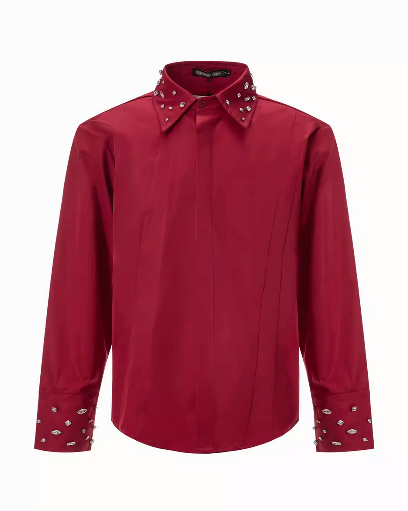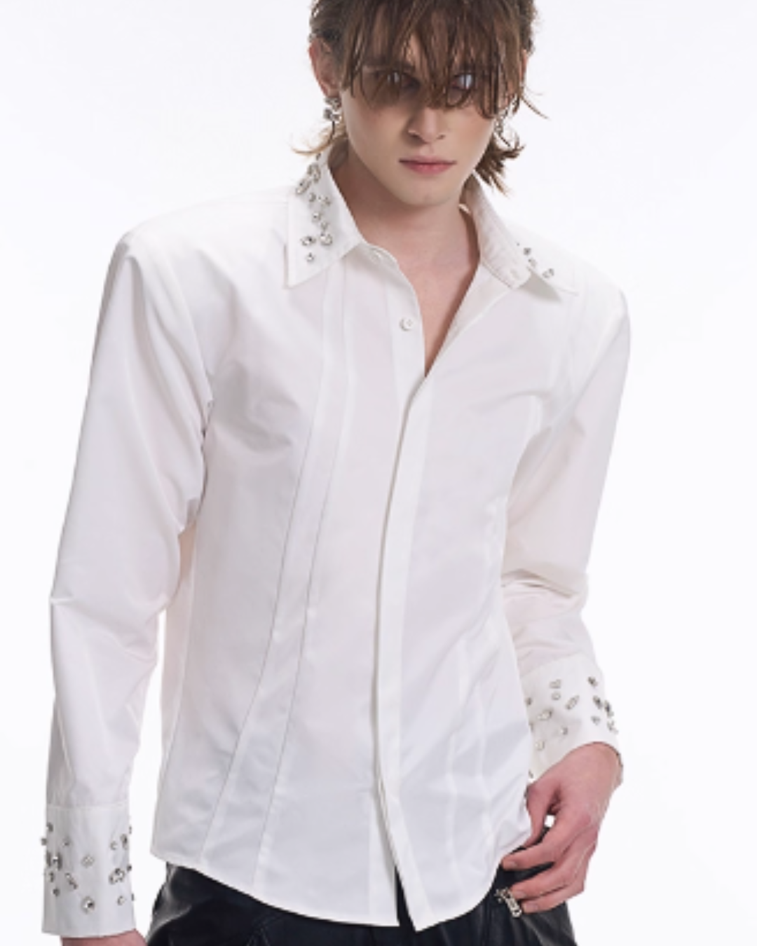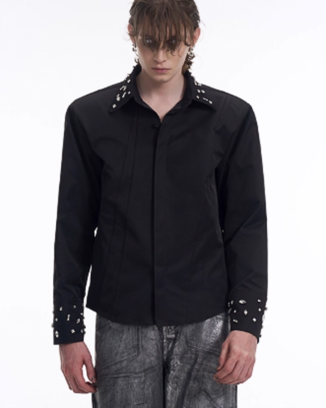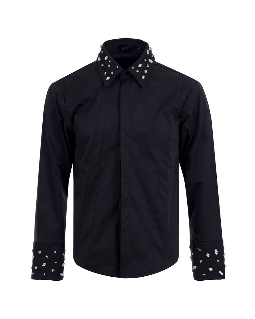 襟と袖部分に散りばめられたビジューが高級感溢れる長袖シャツ。