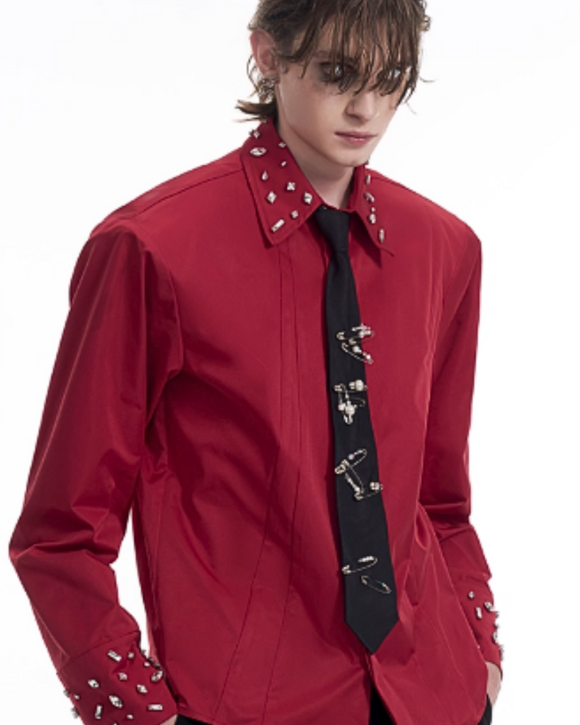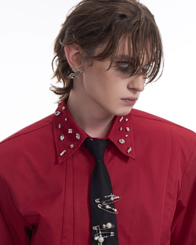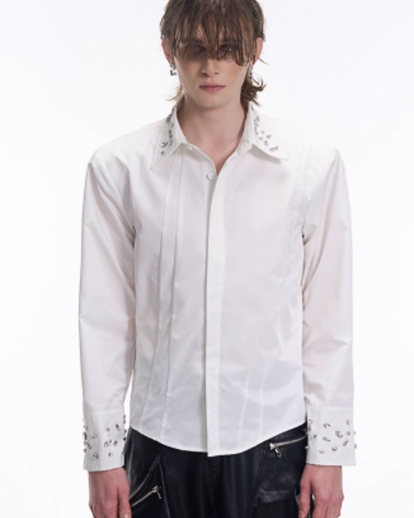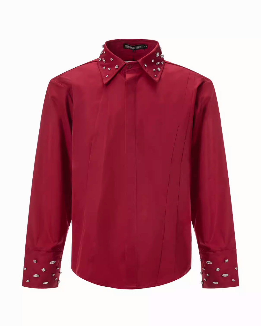 襟と袖部分に散りばめられたビジューが高級感溢れる長袖シャツ。